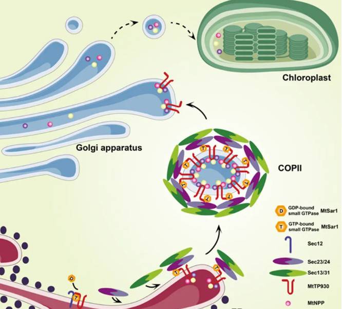 核基因编码叶绿体蛋白分为细胞质合成和内质网合成。细胞质合成的叶绿体蛋白的转运机制已有大量研究:其蛋白的N末端具有叶绿体转运肽,由细胞质分子伴侣识别并转运至叶绿体表面,通过叶绿体被膜两侧的整合膜复合体TOC和TIC进入叶绿体。然而对于没有典型的叶绿体转运肽、在内质网合成的蛋白转运至叶绿体的分子机制却知之甚少。近日,中国农业大学生物学院王涛、董江丽团队在The Plant Cell发表了题为 “A c
