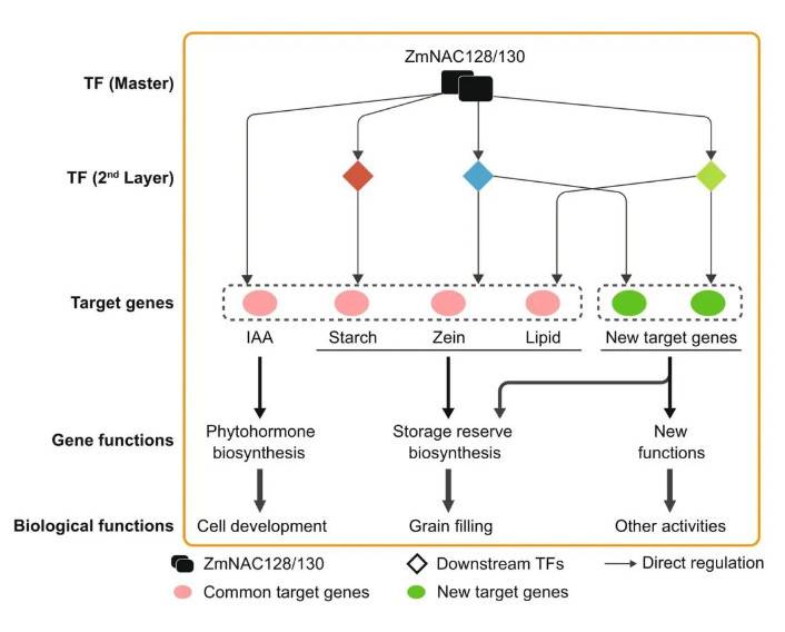 2024年7月4日,中国农业大学宋任涛教授课题组在New Phytologist杂志上在线发表了题为“The biosynthesis of storage reserves and auxin is coordinated by a hierarchical regulatory network in maize endosperm”的研究论文。该工作揭示了转录因子ZmNAC128和ZmNAC1