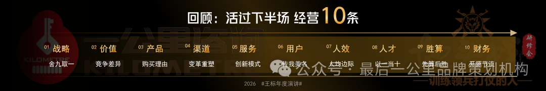 那么,如何重构我们活过下半场的战略?我们整理了年度演讲“活过下半场”的经营10条。这10条分别是: