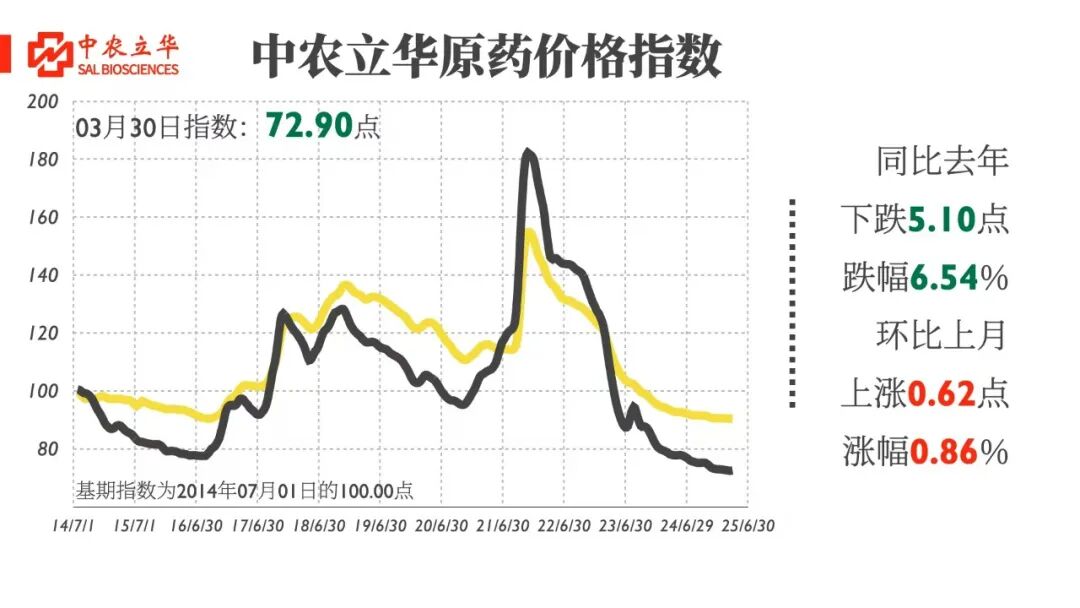 2025年3月30日,中农立华原药价格指数报72.9点,同比去年下跌6.54%,环比上月上涨0.86%。跟踪的上百个产品中,同比去年54%产品下跌;环比上67%产品持平,12%产品上涨。