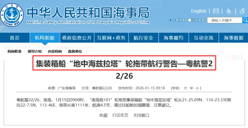 广东海事局1月15日发布粤航警22/26航行预警:当日9时,“南海救101”轮拖带MSC集装箱船“MSC ZLATA R(兹拉塔)”号,从21-25.09N,114-23.33E前往22-7.5N,113-46E,拖带长度1111米,航速4.5节,提醒过往船舶加强瞭望、注意避让。