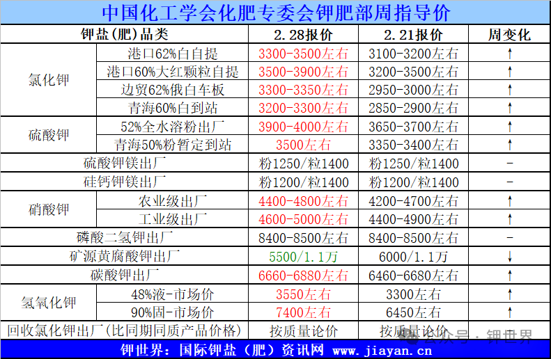 港口62%白钾报价涨至3300-3500元/吨左右,60%大红颗粒报价涨到了3500-3900元/吨左右,高端全部出现在东北区域,而低端是否能有货源提供还需实际确认,很可能有也只是极少量的货源;青海大厂3月份价格为60%标准钾到站2800元/吨,此价位为暂定价,据称实际收款时的价格还要略高出一定的比例,因此代理商销售报价起步价就达到了3100元/吨,后来又涨至3200-3300元/吨左右;边贸62%白钾有个别报价涨至3300元/吨以上,听说60%大红颗粒有个别报价涨至3600元/吨以上,总体看报价依然不够明朗,但是肯定也是在继续跟涨。硫酸钾方面,加工型曼海姆硫酸钾52%全水溶粉出厂价涨至3900-4000元/吨左右,基本跟随氯化钾而涨;资源型硫酸钾青海产50%粉市场到站价涨至3500元/吨左右,涨幅暂时相对小一些。国产钾产量低、库存少的局面暂时没有显著改善,3月份以后藏格复产,届时国产钾供应能力将有较明显的恢复;港口港存数量285万吨左右,较明显下降,具体1-2月份进口数量还在等待海关公布,市场认为进口量应该会有明显减少,所以货源才如此紧张;边贸2月份货物的车号很多都还未出,3月新单暂时杳无音信;多地中欧班列货点暂时无货可售。总体看,氯化钾货源十分紧张。加工型硫酸钾开工率75%左右,暂时无变化,但后续有降低可能,因为原料氯化钾供应紧张;资源型硫酸钾开工尚可,暂时还是还货为主,可流通货源不多。东北市场需求较旺盛,其它市场暂时高价走货有一定的困难,也就是说需求还不是特别着急。不过下游产品高价遇到销售压力的现象较为普遍,后续若价格持续高企,需求或将有所减少。后市预测: