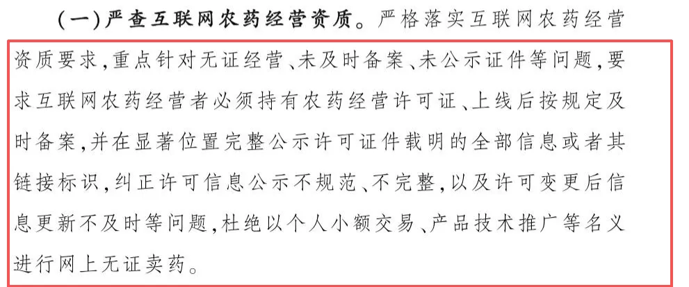 尤其是自2025年12月份农业农村部发布关于互联网经营农药专项治理行动方案的通知,明确声明自2026年1月1日起开展为期一年的互联网农药经营专项整治,其中第一项就是严查互联网农药无证经营。