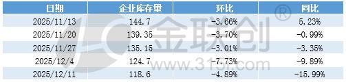 据金联创统计,截止12月11日国内尿素企业库存量在118.6万吨,较12月4日环比下降4.89%,同比下滑15.99%。目前尿素企业库存量已连续5周呈现下跌状态。