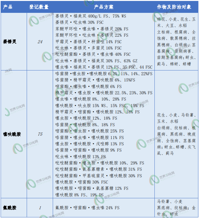 而氟唑菌酰羟胺、三氟吡啶胺的相关种子处理产品的登记和上市仍是以原研企业进行推动,如先正达南通作物保护有限公司登记了中国市场上氟唑菌酰羟胺唯一的种子处理制剂产品——200克/升氟唑菌酰羟胺种子处理悬浮剂,防治水稻恶苗病;瑞士先正达作物保护有限公司登记了中国市场唯二的两项种子处理产品——200克/升、500克/升三氟吡啶胺种子处理悬浮剂,用于小麦茎基腐病、水稻恶苗病、大蒜根腐病,以及玉米茎基腐病的防治。