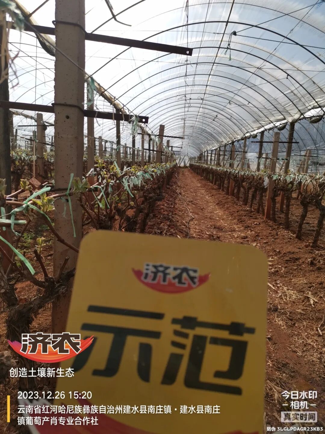 云南省红河州建水县南庄镇干塘村的王老板,今年种植了50亩夏黑葡萄,王老板是一个特别喜欢学习和钻研的种植户,尤其喜欢钻研作物及相关农业投入品。王老板在种植前期使用了济农豹子头淋冲升级版腐植酸水溶肥(简称“淋冲”),对于淋冲,王老板将这款产品的功能定位于可以养根、富根的长效氮肥,合理的碳氮比可控制树势,既可以促进树势生长,又不会出现旺长的现象。在使用方法上,王老板集中在葡萄生长周期的前中期使用。11月