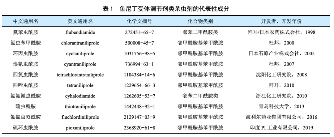 双酰胺类杀虫剂的研发始于20世纪90年代,凭借独特的作用机理、极高的生物活性、持久的药效,以及对哺乳动物极低的毒性和对非靶标生物的高度安全性(蜜蜂除外),上市后迅速受到市场的广泛关注,同时也极大地激发了全球农化企业的开发积极性。截至目前已获得ISO通用名并作用于害虫鱼尼丁受体的双酰胺类杀虫剂有10余种(表1)。按化学结构差异可分为邻苯二甲酰胺类和邻甲酰胺基苯甲酰胺类,有别于传统作用于昆虫神经系统的有机磷、拟除虫菊酯、新烟碱等杀虫剂,这些化合物共同作用于昆虫肌肉系统的鱼尼丁受体上,引起脂质体上钙离子通道持续开放,造成钙离子流失,导致昆虫肌肉持续收缩,表现为快速停止取食、麻痹、拒食、回吐脱粪,进而瘫痪死亡。双酰胺类杀虫剂作用机理独特,是害虫抗药性治理的有效工具之一,国际杀虫剂抗性行动委员会(IRAC)将其归类为28组。