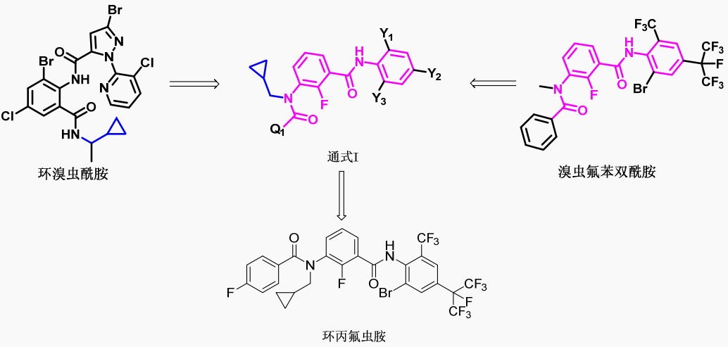 双酰胺类杀虫剂是全球研发的热门领域,其中,间二酰胺类化合物不仅拥有全新作用机理,而且活性高、杀虫谱广。泰禾研发团队对该类化合物进行了系统研究,借鉴了双酰胺类杀虫剂的研发路径,将环溴虫酰胺(cyclaniliprole)结构中的环丙甲基引入间二酰胺的骨架中,形成通式Ⅰ的化合物系列。公司通过对修饰化合物杀虫活性测试结果显示,引入环丙甲基后的化合物对二化螟的杀虫活性显著提高,同时,对鱼、藻、溞等水生生物的安全性也得到明显改善。有鉴于此,研究人员合成了大量的通式Ⅰ化合物,经过多轮构效关系分析,结合安全性评价结果,最终于2018年发现了活性优异、综合性能最佳的环丙氟虫胺,2019年启动登记,同年获得中文通用名。