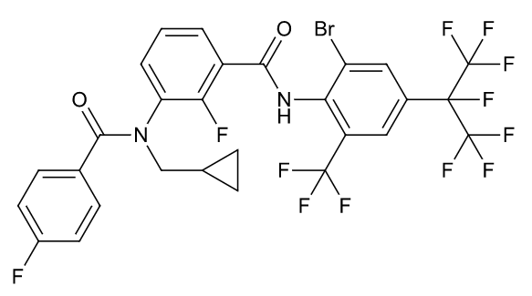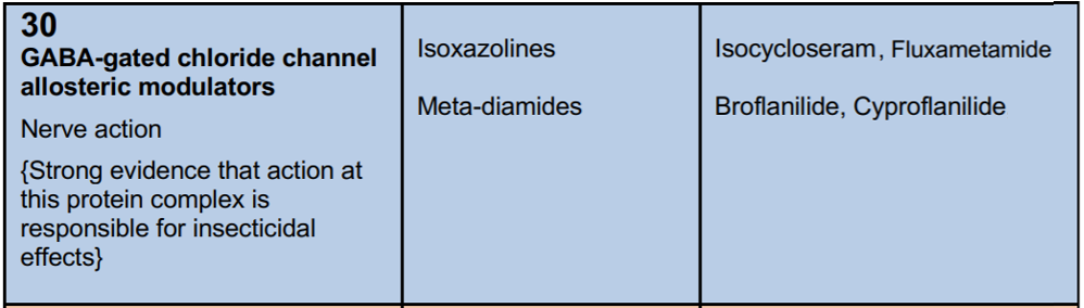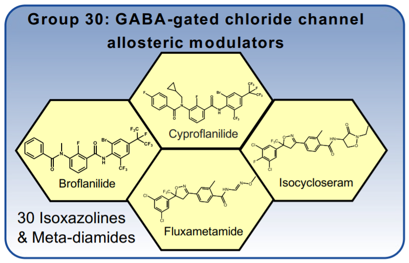 目前,IRAC第30组中包括两类化学结构的4个产品,也即,间二酰胺类产品溴虫氟苯双酰胺(broflanilide)、环丙氟虫胺(cyproflanilide),以及异噁唑啉类产品异噁唑虫酰胺(isocycloseram)、氟噁唑酰胺(fluxametamide)。其中,溴虫氟苯双酰胺最先进入该组,环丙氟虫胺新近加盟。IRAC第30组中的杀虫剂作用机理新颖,与其他组别的杀虫剂无交互抗性,有利于害虫的综合治理和抗性管理。