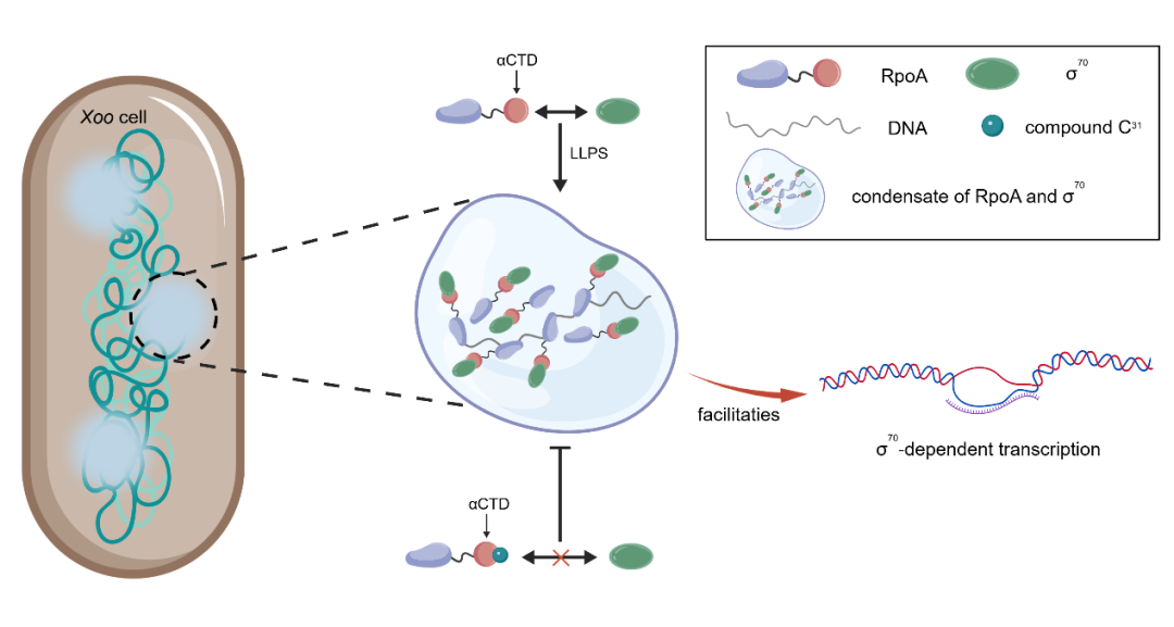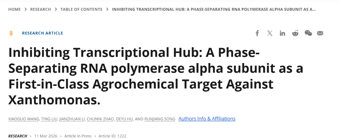 近日,贵州大学绿色农药全国重点实验室博士生王小果作为第一作者,宋润江教授和胡德禹教授作为共同通讯作者,在国际知名学术期刊《Research》(影响因子10.9) 上在线发表题为“Inhibiting Transcriptional Hub: A Phase-Separating RNA Polymerase Alpha Subunit as a First-in-Class Agrochemical Target Against Xanthomonas”的研究论文。文章系统揭示了水稻白叶枯病菌(Xanthomonas oryzae pv. oryzae, Xoo)通过RNA聚合酶α亚基(RpoA)与σ70因子发生液-液相分离形成“转录枢纽”,从而调控全局毒力基因表达的分子机制,并发现丁香酸衍生物C31可通过靶向RpoA抑制相分离过程,为植物细菌性病害防控提供了全新策略。