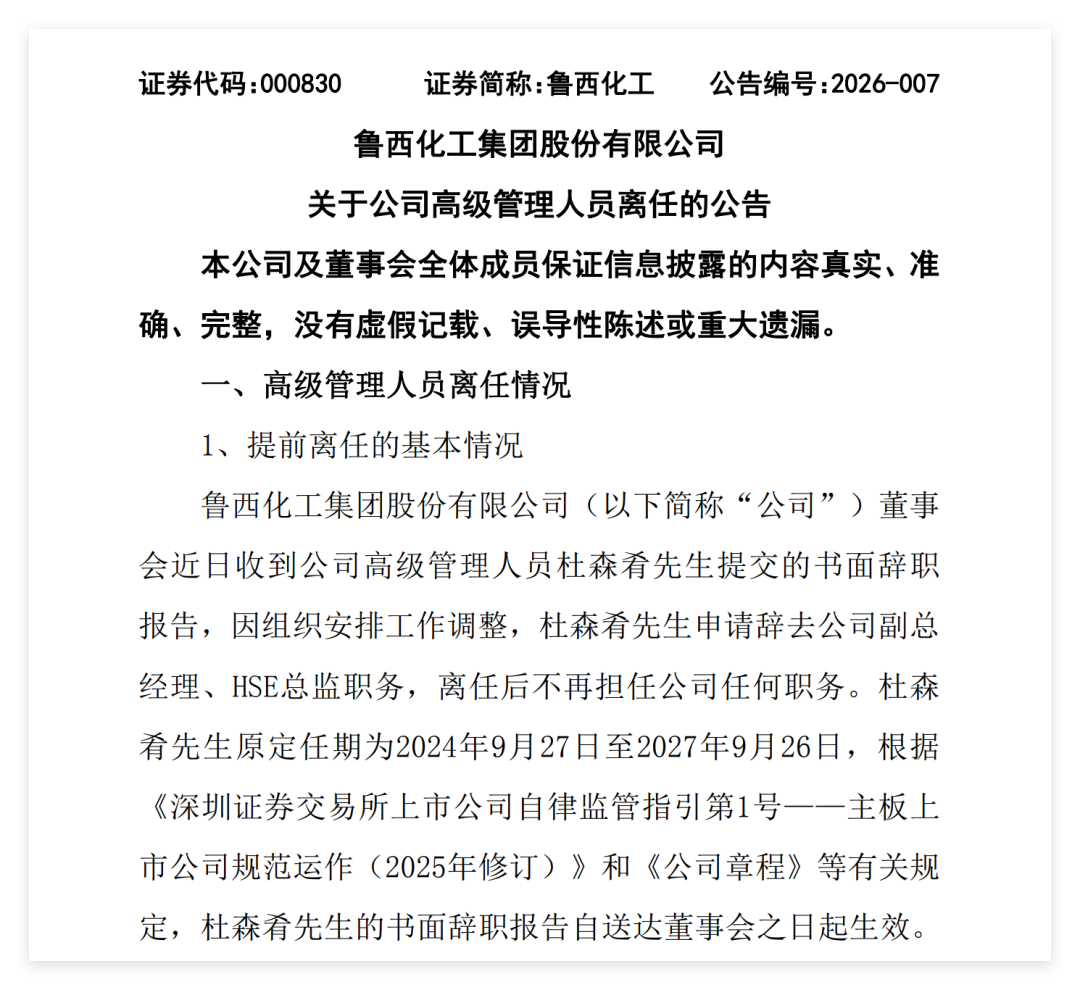 3月13日,鲁西化工集团股份有限公司(以下简称“鲁西化工”)发布公告称,鲁西化工董事会近日收到公司高级管理人员杜森肴提交的书面辞职报告,因组织安排工作调整,杜森肴申请辞去公司副总经理、HSE总监职务,离任后不再担任公司任何职务。