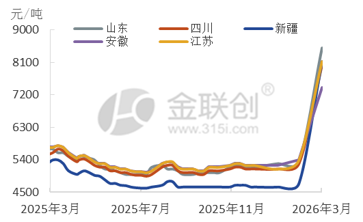 下旬,国内三胺市场迎来加速暴涨,中东地缘冲突引发国际尿素供应恐慌,推动国内尿素价格形成强力支撑,部分停车企业装置陆续恢复生产,行业开工率回升至70%左右,但个别厂家采取限量接单模式,待发订单充足,现货流通紧张局面未得到缓解。叠加下游“买涨不买跌”的补库情绪及出口订单跟进,以至月底均价(除新疆外)快速冲高至8293元/吨,个别区域企业单日价格上涨950-1000元/吨。原料尿素高位震荡,中旬后虽受春耕尾声及储备投放影响小幅回落,但国际尿素暴涨形成比价支撑,叠加煤炭成本高位运行,对三聚氰胺成本面支撑不减。供需端来看,市场平均开工率维持在65%-70%,厂家惜售挺价意剧增,库存处于低位;而需求端随着下游行业全面复工,刚需集中释放,内外贸订单同步发力,采购积极性高涨,进一步助推价格上涨。