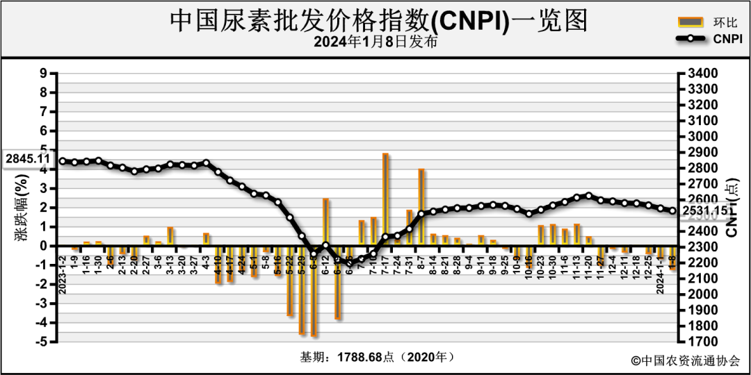 1月8日中国尿素批发价格指数(CNPI)为2531.15点,环比下跌33.99点,跌幅为1.33%;同比下跌306.38点,跌幅为10.80%;比基期上涨742.47点,涨幅为41.51%