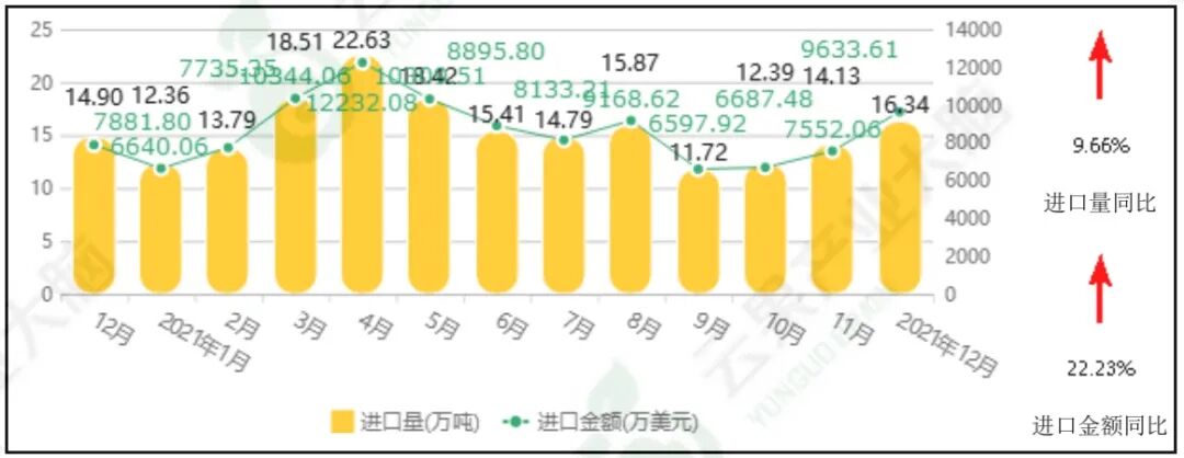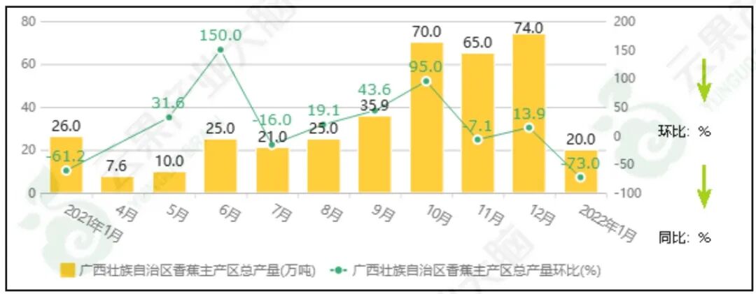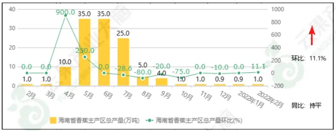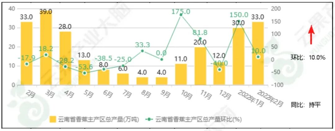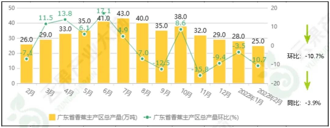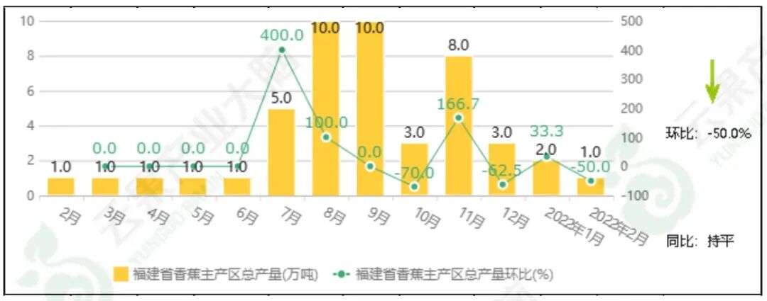 从历史数据来看,2021年2月~2022年2月,全国香蕉主产区总产量从61.0万吨波动至60.0万吨;每月对应的增加/减少幅度也从-27.4%变化至-25.8%;近一年峰值为2021年11月的126.0万吨,谷值为2022年2月的60.0万吨。