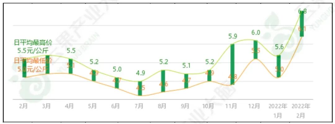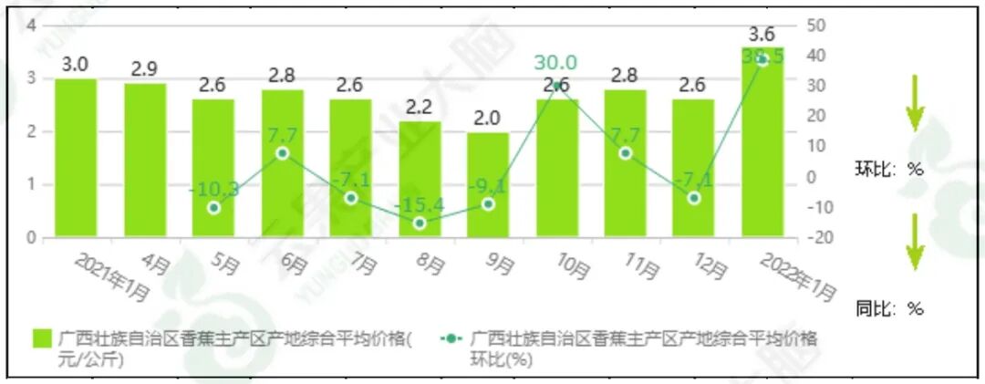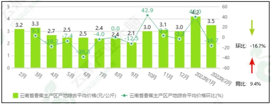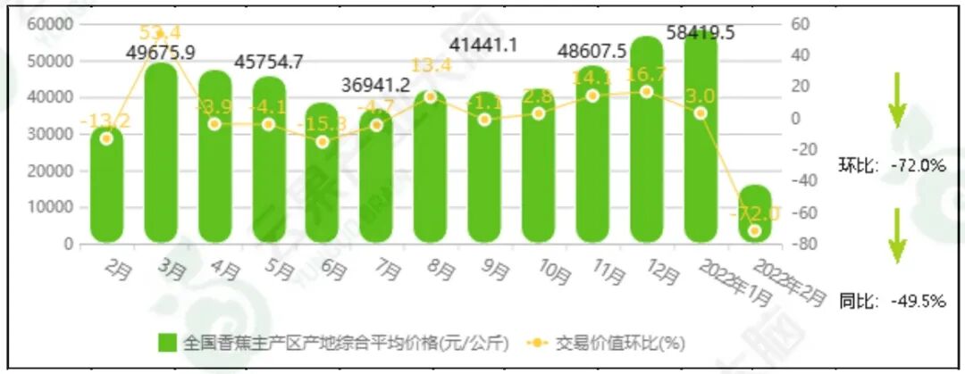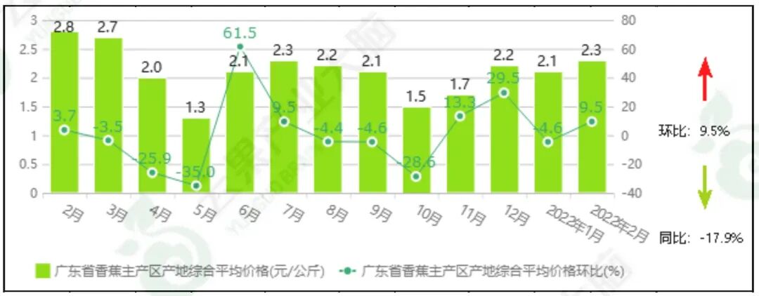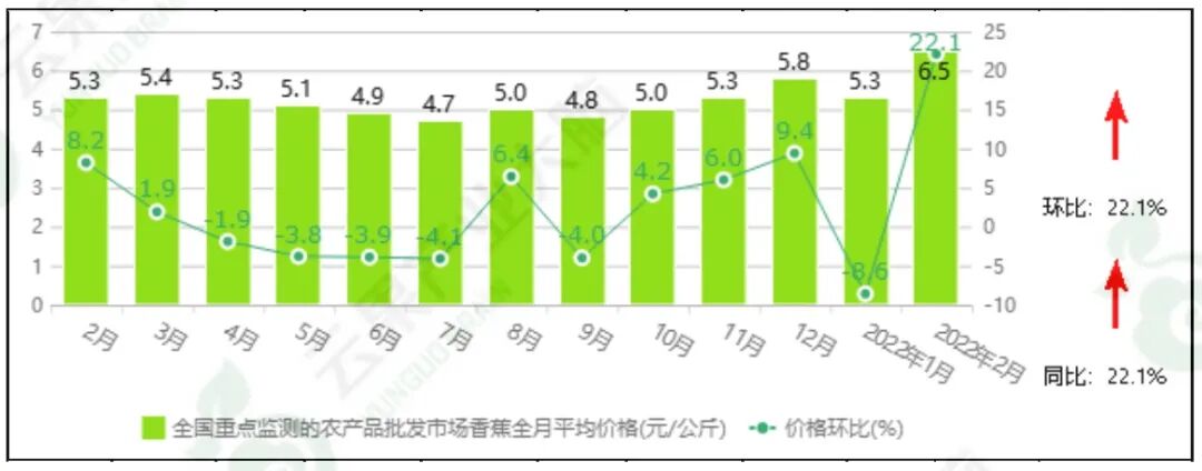 从历史数据来看,2021年2月~2022年2月,全国香蕉主产区产地综合平均价格从3.0元/公斤波动至3.0元/公斤;每月对应的上涨/下降幅度也从1.6%变化至-8.8%;近一年峰值为2022年1月的3.3元/公斤,谷值为2021年5月的1.8元/公斤。