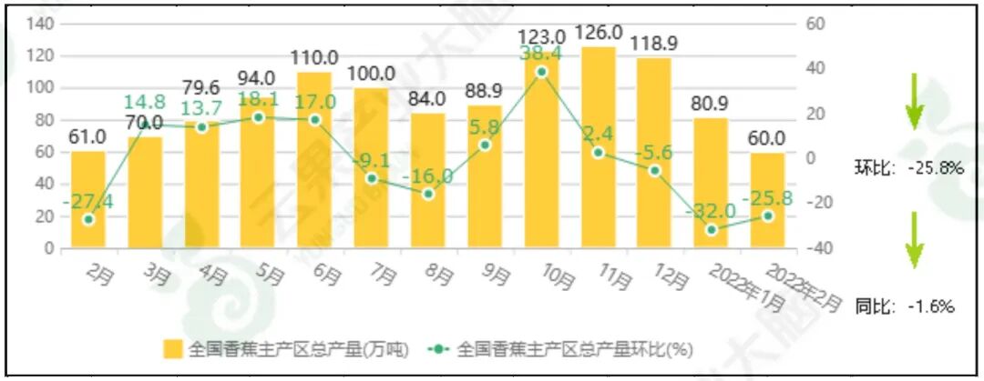 2022年2月,全国香蕉主产区总产量为60.0万吨,与上月相比,减少了25.8%;与去年同期相比,减少了1.6%。