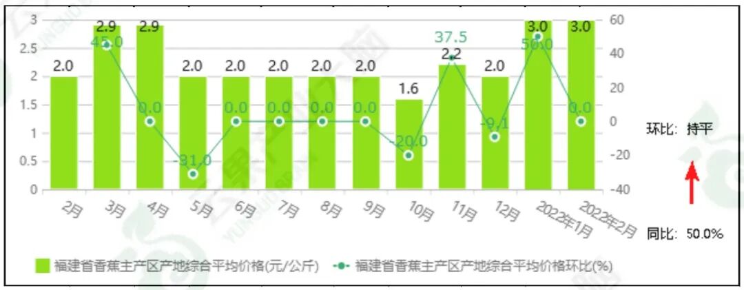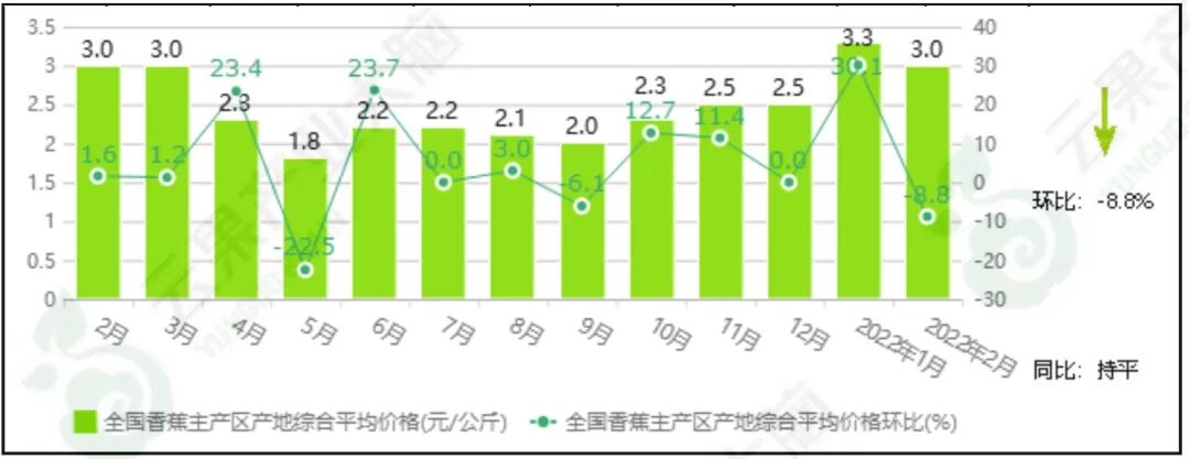 2022年2月,全国香蕉主产区产地综合平均价格为3.0元/公斤,与上月相比,下降了8.8%;与去年同期相比,基本持平。