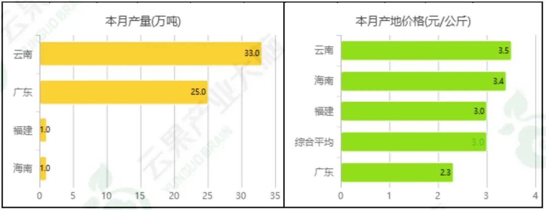 细分产区来看,2022年2月,全国香蕉主产区按产量从高到低排名依次是:云南省33.0万吨、广东省25.0万吨、海南省1.0万吨、福建省1.0万吨,广西壮族自治区因季节原因无产量;按产地均价从高到低排名依次是:云南省3.5元/公斤、海南省3.4元/公斤、福建省3.0元/公斤、广东省2.3元/公斤。