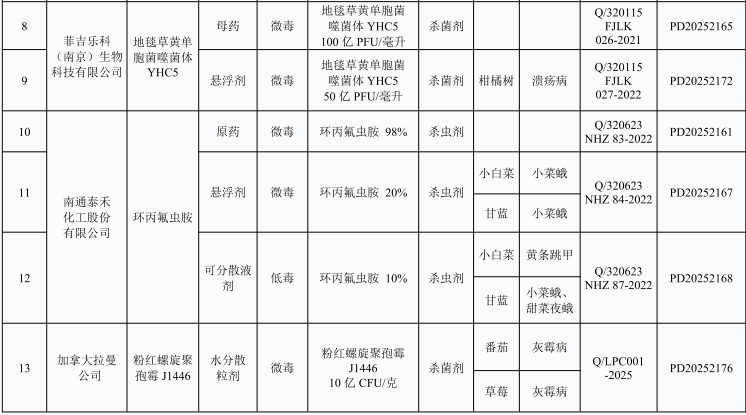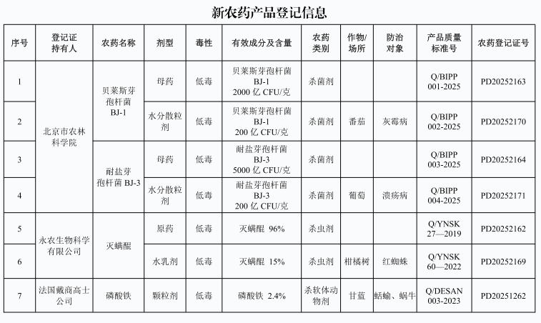 近日,根据《农药管理条例》、《农药登记管理办法》等有关规定,经全国农药登记评审委员会评审,批准北京市农林科学院等6家单位申请的7个新有效成分、13个新农药产品登记,核发《农药登记证》,核准产品标签。本次获批新农药呈现以下特点:一是生物农药占比高。通过登记的7个有效成分中,生物农药占5个,体现了先进生物技术推进农药发展的新成果,为推动农业绿色发展增添新助力。二是对环境友好。本次新批准的农药均为低微毒