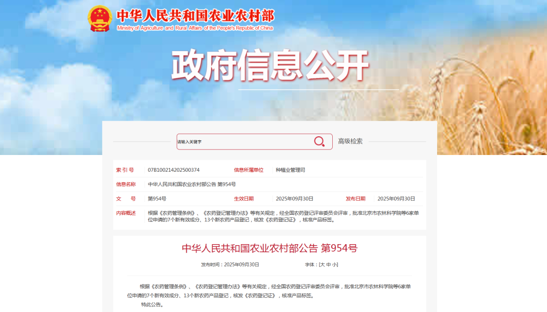 近日,根据《农药管理条例》、《农药登记管理办法》等有关规定,经全国农药登记评审委员会评审,批准北京市农林科学院等6家单位申请的7个新有效成分、13个新农药产品登记,核发《农药登记证》,核准产品标签。