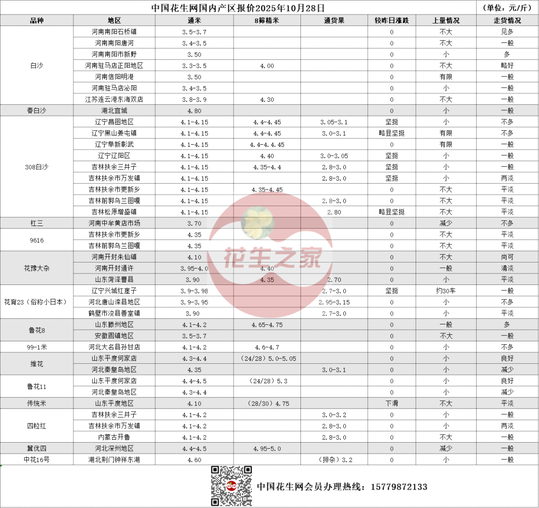 吉林产区扶余市三井子308白沙通果收2.8-3.0,通货米收4.1左右,8个筛上精米4.35-4.4左右,四粒红原装通货米4.1-4.2左右,东北王统米收4.3-4.35,维花8号统米好的收4.3左右,9616统米好的收4.35左右;松原增盛白沙打米果通货收2.8左右,统米收4.1-4.15左右;内蒙古通辽市开鲁地区四粒红通货米收4.1-4.2,下料米3.8-4.0,打米果2.8-3.0左右,选果用通果3.0-3.2左右;价格稳中略显坚挺,基层上量偏小,需求方按需采购,询价问货的尚可,成交一般;