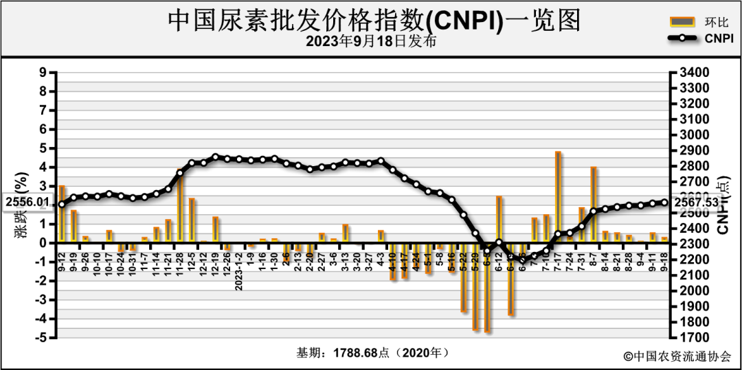 9月18日中国尿素批发价格指数(CNPI)为2567.53点,环比上涨6.47点,涨幅为0.25%;同比下跌31.48点,跌幅为1.21%;比基期上涨778.85点,涨幅为43.54%。