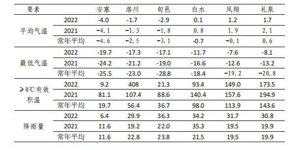结合前期气候条件、陕西苹果始花期预测模型、果树长势 及未来气候预测,预计今年我省苹果始花期主要集中在3 月 30 日—4 月21 日,较去年持平或偏早 1~3 天,明显早于常年,其中关中果区与去年持平,陕北、渭北东西部果区较去年偏早1~3 天。各区域具体预测结果:关中果区在 3 月 27 日—4 月 6 日,渭北东部果区在 4 月 2—9 日,渭北西部果区在 4 月 8—17 日,延安果区在 4 月 11-18 日,榆林果区在 4 月 12-21 日(图 1)。1.越冬期极寒天气少,果园底墒好,利于果树安全越冬越冬期(2021年12月至2022年2月),我省苹果主产区平均气温较去年偏低 0.1~1.8℃,≥0℃有效积温 0.9~254.9℃,较去年偏少 31.9~110.0℃;越冬期最低气温-22.3~-5.7℃, 较去年普遍偏高 1.9~7.7℃,低温强度偏弱,延安西北部、榆林果区9县达到果树越冬期轻度冻害指标(≤-20℃)累计日数1-2 天;降水量 9.0~63.9 毫米(表 1),较去年大部果区偏少 1~8 成,但由于去年秋季降水显著偏多,果区土壤墒情良好。全省果区越冬期气候以冷湿型为主,对于果树需冷量的积累、减少冬季冻害发生和降低果树病虫害安全越冬基数非常有利,综合气象条件适宜于果树安全越冬。