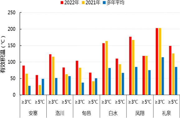 今年以来(1月1日至3月20日),全省果区≥3℃、≥5℃ 有效积温分别为72.7~261.3℃和 47.9~184.2℃,与去年相比,≥3℃有效积温渭北西部、延安和榆林果区偏多 1.0~24.6℃, 关中、渭北东部果区偏少 2.6~56.7℃;≥5℃有效积温全省果区偏多 1.6~35.7℃。全省果区稳定通过 3℃和 5℃初日分别较去年提前 1~6 天和 3~8 天(图 2)。3月气温回升迅速,截至25日,全省果区平均气温10.7℃,较去年偏高 2.4℃,为1961年来最高;日照时数117.3~235.5小时,较去年大部果区偏多2.3~113.6小时;3月降雨量 0.2~49.8毫米,较去年陕北果区偏少1~9成,关中、渭北东西部果区偏多 1~9成,据50cm土壤墒情监测显示果区土壤底墒适宜。苹果代表县≥3℃、≥5℃有效积温与近3年、常年同期对比图