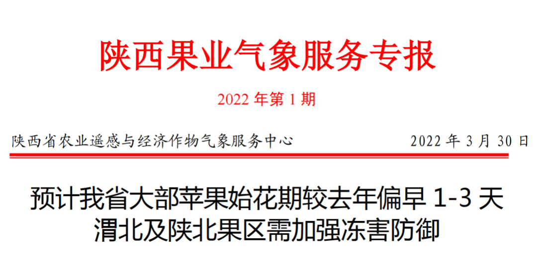 2022年3月30日,陕西省农业遥感与经济作物气象服务中心,发布2022年第一期《陕西果业气象服务专报》,具体内容如下:摘要根据气候条件及果园调查分析,结合苹果始花期和冻害风险预测模型,预计 2022 年我省大部苹果始花期较去年偏早 1~3 天,明显早于常年,花期冻害风险总体偏轻。陕北、渭北西部及渭北东部偏北果区为冻害重点防御区域,4 月上中旬为重点防御时段。预计 4 月我省将出现 3 次中等偏弱