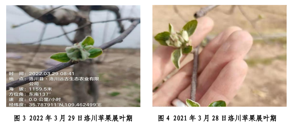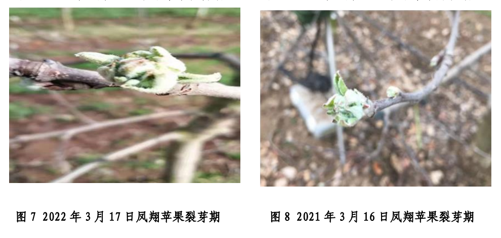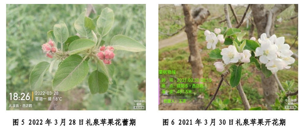 苹果代表县≥3℃、≥5℃初日与近3年、常年同期对比图据物候调查显示,目前榆林、延安北部果区处于膨大—芽开绽期,延安南部、渭北西部果区处于芽开绽期,渭北东部、关中果区处于展叶—花蕾期。与去年同期相比,陕北、渭北东 西部果区基本持平,关中果区略晚于去年(图 3-8)。据最新短期气候预测,3 月底至 4 月下旬我省主要果区气温偏高、降水持平略偏少,期间将出现 3 次中等偏弱的降温过程,分别为 4 月 11—12 日、4 月 18—19 日和 4 月 25—27 日,有 4次时空分布较均匀的降雨过程;春季透墒雨出现时间较常年偏晚,较去年略偏早;终霜日陕北接近常年,关中、陕南偏早, 较去年全省偏早。结合前期果树长势、始花期预测、全省苹果花期冻害指数预测模型和未来气候预测综合分析,预计今年全省苹果果区花期冻害风险等级总体为偏轻,其中,延安北部及北扩区、关中 和渭北东部果区偏轻,延安中南部、渭北西部果区中度偏轻。重点防御时段:渭北、延安南部果区为 4 月上中旬,延安北部及北扩区为 4 月中下旬。各果区应抓紧做好果园追肥、保墒、保花和病虫害防治,增强树势,提高抗逆性,促进开花坐果。根据生产实际合理安排疏花、定果,提高中心花坐果率,促进优果率提升。