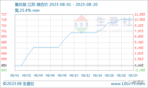 据生意社商品行情分析系统,近期氯化铵行情继续冲高,截至8月20日农业用氯化铵干铵华东地区价格在720元/吨,较月初的650元/吨上涨超10%。其中华东地区农业用氯化铵干铵市场主流价在700~760元/吨。成本面:液氨市场行情月初走低,近期小幅走高,氯化铵成本面有一定支撑。据生意社商品行情分析系统,截至8月20日液氨价格在3400元/吨。液氨止跌小幅回升主因山东地区供应量增加不及预期,北方主产区联盟