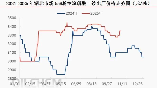 近期,国内磷酸一铵市场受高价原料持续施压,硫黄、硫酸价格同步大涨——长江港颗粒硫黄自提价单周上调245元(吨价,下同),湖北硫酸跟涨约60元,成本支撑显著增强,叠加企业待发订单增加,市场已逐步进入上探通道。截至10月24日,湖北地区55%粉状磷酸一铵主流出厂价约为3350元,较前期累计上调至少50元。受硫黄、硫酸价格持续走高影响,多数工厂因难以锁定成本,已暂停接单、暂停报价;少数企业上调报价。据悉