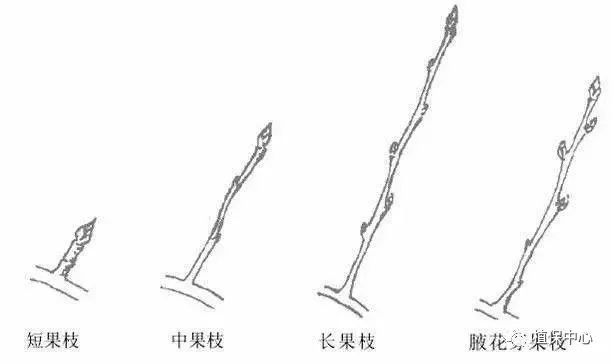 有花芽的当年生枝条,叫结果枝。根据其长短不同,结果枝分为短果枝(5厘米以下)、中果枝(5~15厘米)和长果枝(15厘米以上)。梨树的绝大多数品种以短果枝结果为主。