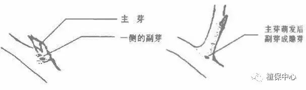 梨树枝条节上着生肉眼可见的芽称为主芽,主芽的两侧着生的极微小、肉眼不易见到的芽叫副芽。一般春季仅主芽萌发,且副芽潜伏起来成为隐芽。