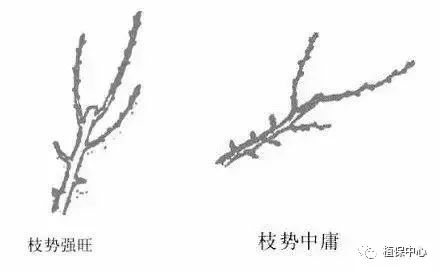 枝势是指枝条的生长势,包括一年生枝和多年生枝。对于梨树的一年生枝而言,可从枝的粗度和长度加以判断。一般直立和斜向上生长枝,枝势强;水平和下垂枝,枝势弱。