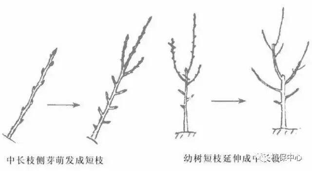 梨树的长枝长放后,侧芽萌发,可形成很多短枝。短枝(包括果台短枝)次年萌发,可延伸成长枝,特别是在受到回缩的刺激时,更是如此。因此,梨树虽然成枝力低,但幼树随着树龄的增大,树体上仍会有很多长枝。品种不同,枝条的转化能力也略有差别。