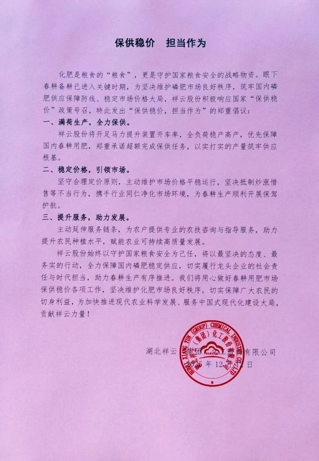12月12日,湖北祥云(集团)化工股份有限公司发布《保供稳价,担当作为》倡议书: