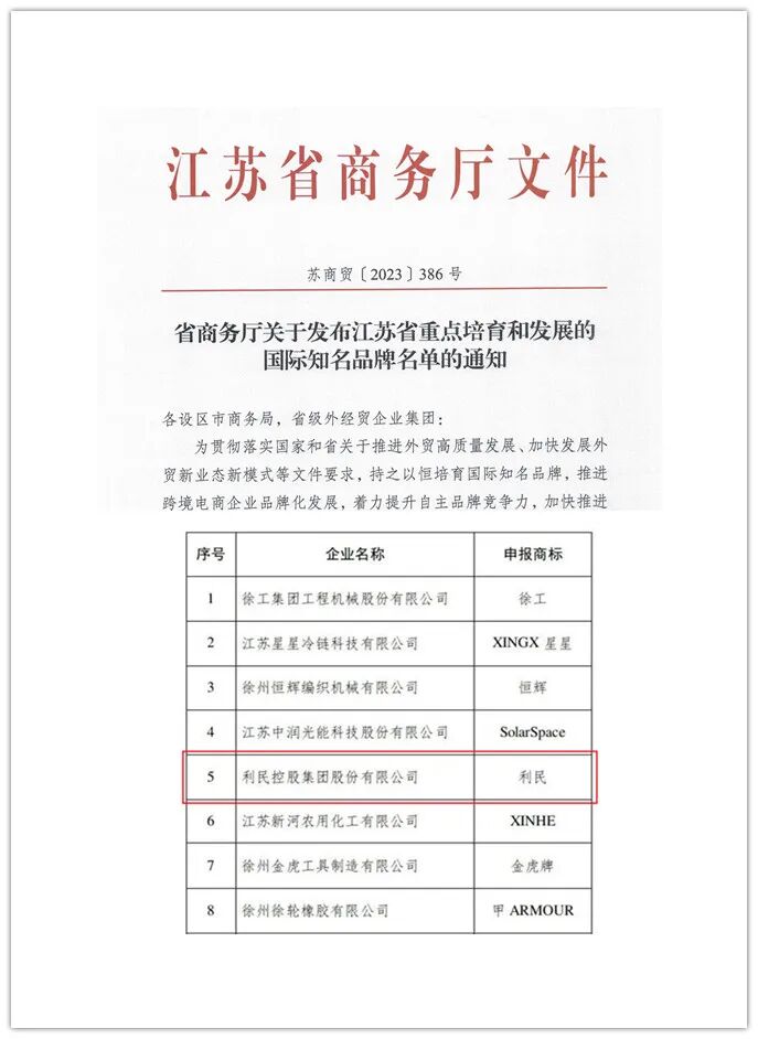近日,江苏省商务厅公布了“2023-2025年度江苏省重点培育和发展的国际知名品牌名单”,“利民”品牌再次入选“江苏省重点培育和发展的国际知名品牌”。为了贯彻落实江苏省关于推进外贸高质量发展、加快发展外贸新业态新模式等文件要求,持之以恒培育国际知名品牌,推进跨境电商企业品牌化发展,着力提升自主品牌竞争力,江苏省商务厅开展了重点培育和发展的国际知名品牌评选工作,每三年组织一次,重点考察企业研发创新能