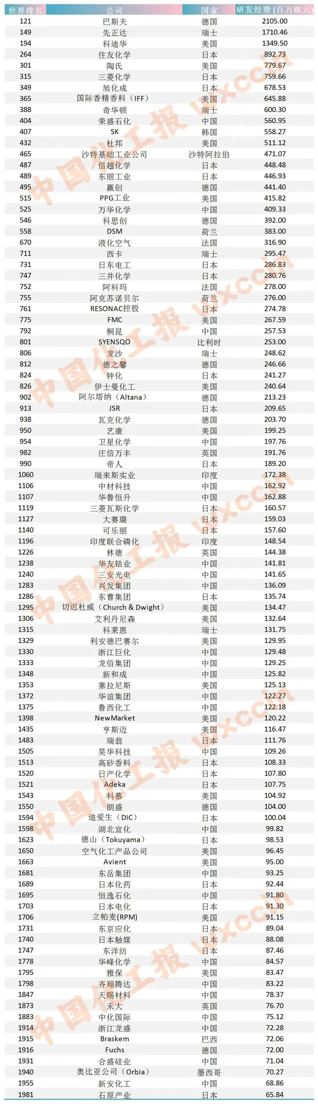 华鲁恒升、兴发、鲁西、湖北宜化、中化、新安化工等25家中国化企上榜全球研发投入2000强(附名单)
