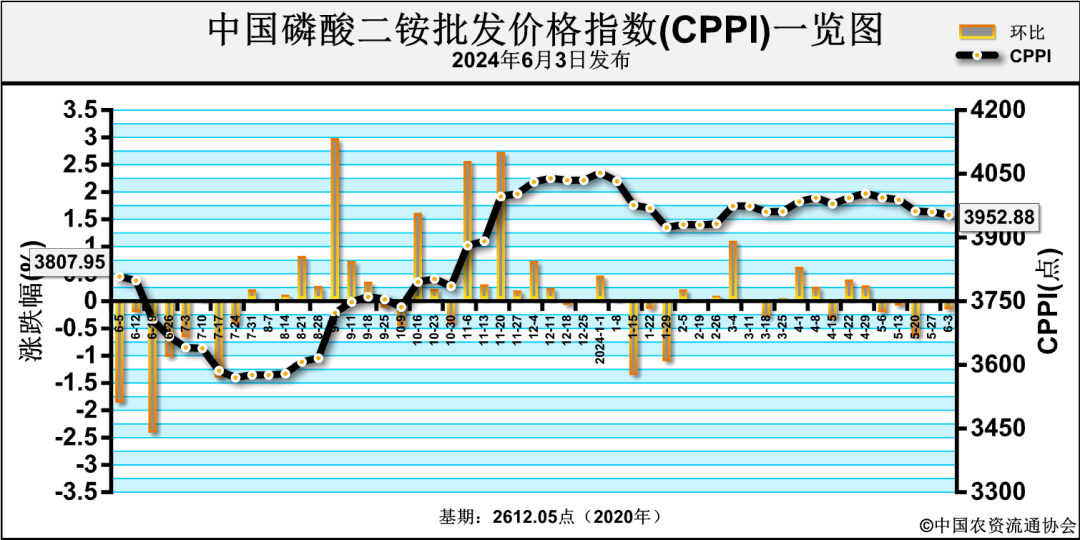 6月3日中国磷酸二铵批发价格指数(CPPI)为3952.88点,环比下跌7.44点,跌幅为0.19%;同比上涨144.93点,涨幅为3.81%;比基期上涨1340.83点,涨幅为51.33%。