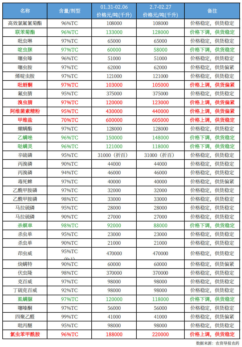 96% 联苯菊酯下跌2000元,至128000元/吨,97% 啶虫脒下跌2000元,至58000元/吨,97% 吡蚜酮上涨2000元,至105000元/吨,97% 溴虫腈上涨3000元,至123000元/吨,95% 阿维精粉上涨10000元,至440000元/吨,70% 甲维盐上涨5000元,至605000元/吨,96% 乙螨唑下跌2000元,至148000元/吨,96% 哒螨灵下跌3000元,至118000元/吨,98% 杀螟单下跌4000元,至88000元/吨,97% 虱螨脲下跌2000元,至118000元/吨,96% 氯虫苯甲酰胺 上涨32000元,至220000元/吨。