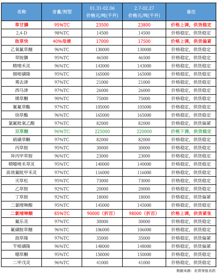 95% 草甘膦上涨300元,至23800元/吨,40% 敌草快上涨500元,至17500元/吨,96% 双草醚下跌5000元,至220000元/吨,85% 二氯喹啉酸 上涨8000元,至98000(折百)元/吨。