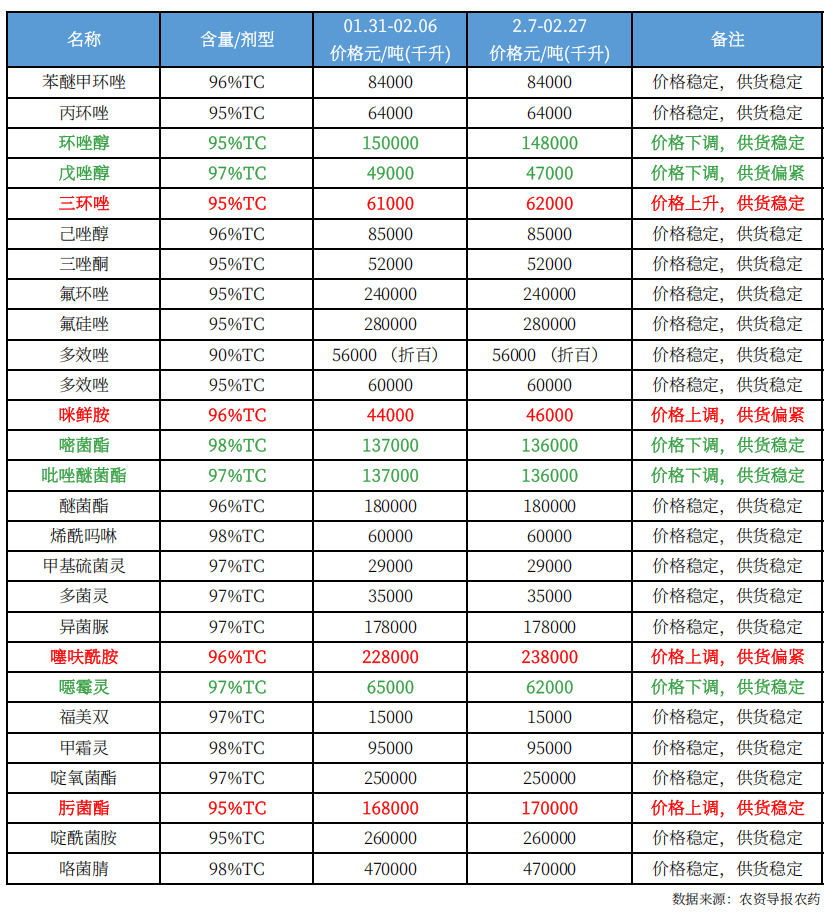 95% 环唑醇下跌2000元,至148000元/吨,97% 戊唑醇下跌2000元,至47000元/吨,95% 三环唑上涨1000元,至62000元/吨,96% 咪鲜胺上涨2000元,至46000元/吨,98% 嘧菌酯下跌1000元,至136000元/吨,97% 吡唑醚菌酯下跌1000元,至136000元/吨,96% 噻呋酰胺上涨10000元,至238000元/吨,97% 噁霉灵下跌3000元,至62000元/吨,97% 肟菌酯上涨2000元,至170000元/吨。