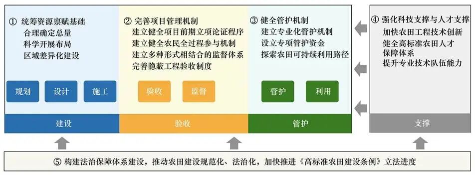 为打造新时代更高水平生态型国家粮仓,解决当前出现的高标准农田质量问题,亟需立足全局统筹谋划,针对关键环节与薄弱链条加强高标准农田体制机制建设,构建高效、可持续的建设体系(见图1)。