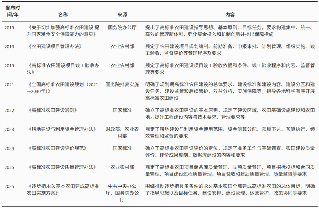 在制度标准体系层面,从顶层设计到全链条保障逐步细化。2012年以来,高标准农田制度标准体系从建立到健全,并于2018年机构改革后持续完善,通过强化顶层设计、细化实施路径与建设标准、落实资金保障、抓好建后管护与利用,构建起覆盖规划、建设、验收、管护全链条的制度框架,见表1。十多年来,我国先后编制实施了《全国高标准农田建设总体规划(2013—2020年)》《全国高标准农田建设规划(2021—2030年)》等相关规划或方案7套,发布实施《国务院办公厅关于切实加强高标准农田建设提升国家粮食安全保障能力的意见》《农业农村部关于推进高标准农田改造提升的指导意见》等指导意见12部,制定和修订《高标准农田建设 通则》(GB/T 30600—2022)、《高标准农田建设评价规范》(GB/T 33130—2024)等国家及行业标准超过6个。