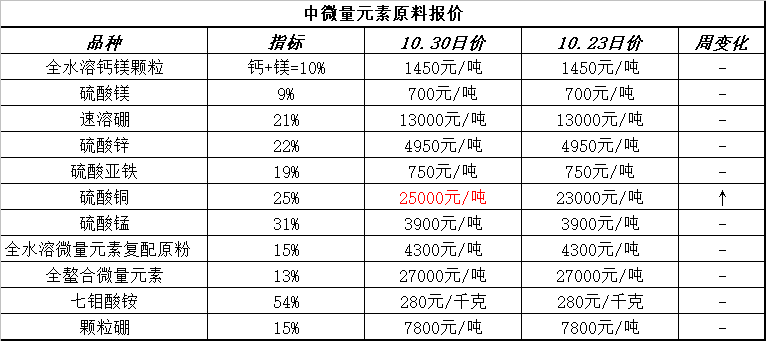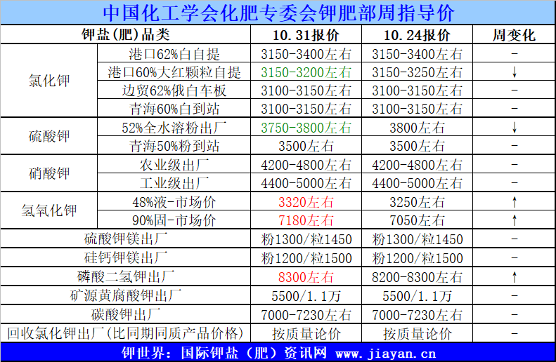 稳:港口62%白钾3150-3400元/吨左右,高端主要在南方市场,北方低约50-100元,总体来看62%白钾仍是氯化钾产品体系中价格最坚挺的;边贸62%白钾3100-3150元/吨左右,货源暂时较少,11月份进口价格据称维稳;青海60%粉晶官方到站价3100元/吨暂稳,市场流通3100-3150元/吨暂稳,盐湖60%钾目前需强供弱,价格稳定可能还会持续;资源型50%粉状硫酸钾到站3500元/吨左右,厂家压力不大,暂时不急于调价。