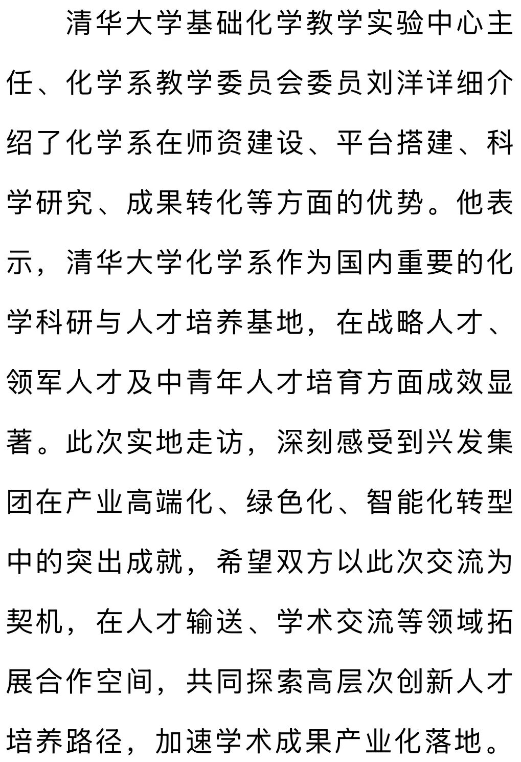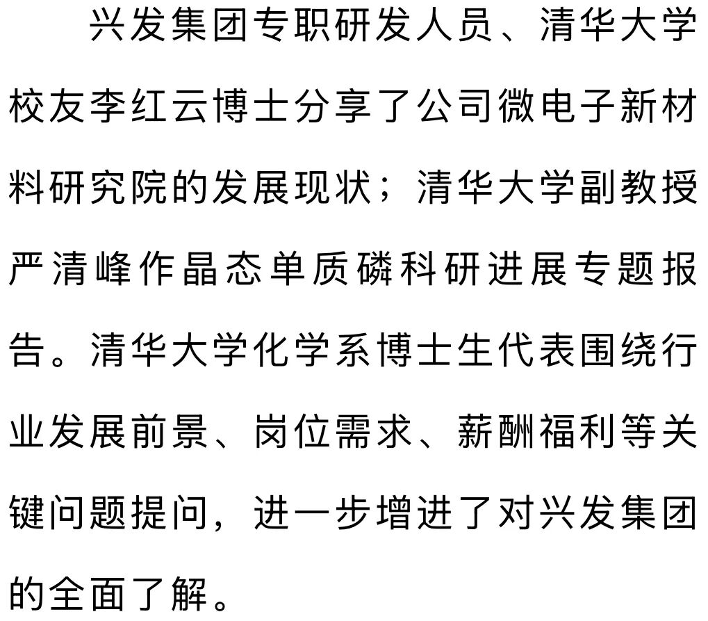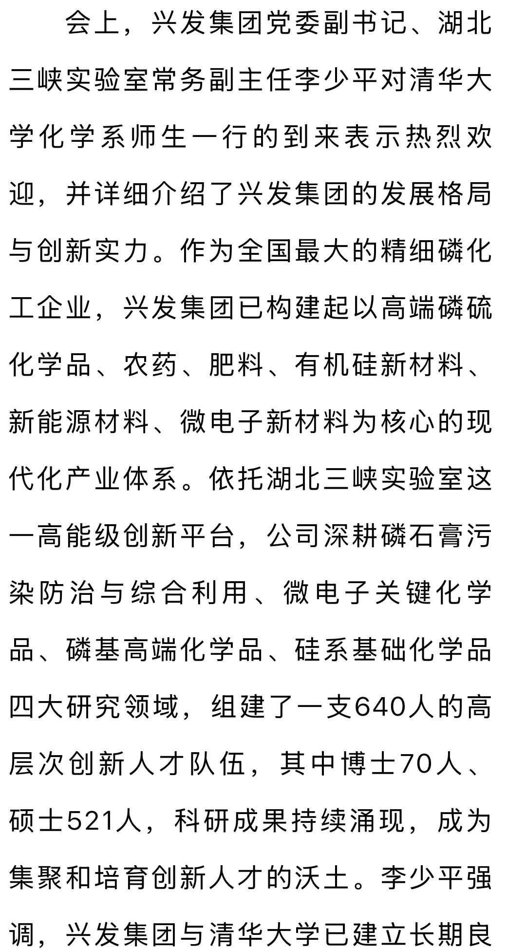 1月23日,兴发集团与清华大学化学系举行交流座谈,双方聚焦产业协同、人才培育等核心议题深入交流,为强化人才引育、赋能公司高质量发展筑牢合作根基。座谈前,清华大学化学系师生来到兴发集团宜昌新材料产业园,参观了智慧管理中心、湖北三峡实验室、沿江424广场,沿着习近平总书记视察兴发的足迹,了解兴发集团贯彻落实总书记“共抓大保护、不搞大开发”的重要指示精神,以壮士断腕决心破解“化工围江”难题,以科技创新、