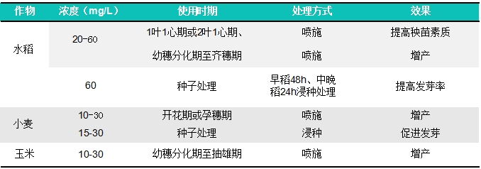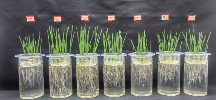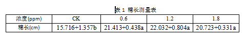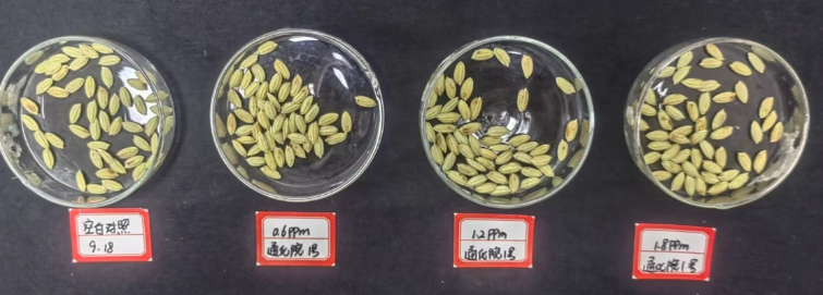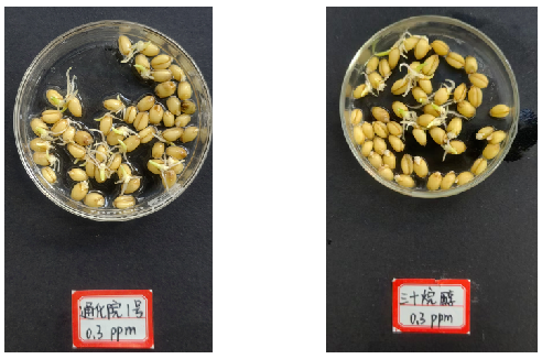 对小麦进行浸种试验,用三十烷醇和通化院1号分别浸种8小时,试验结果表明 使用0.3ppm对小麦进行浸种,可提高40%的发芽率,优于空白对照和三十烷醇。 通化院1号可有效促进小麦的生根,根系生长旺盛,在小麦上的最佳使用浓度为0.6ppm,相较于对照,根长根重均有明显效果,根长增长7.43%,根重增加55.8%,优于空白对照和三十烷醇。