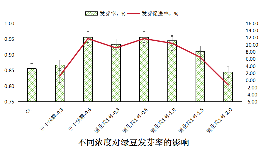 对绿豆进行浸种试验,用三十烷醇和通化院1号分别浸种6小时,试验结果表明:使用0.6ppm对绿豆进行浸种,可提高绿豆10%的发芽率,优于空白对照和三十烷醇,同时通过浸种,可促进绿豆下胚轴伸长,相较于对照长度提高1.9倍,有利于植物苗期后期生长。