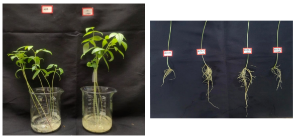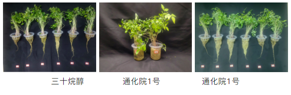 使用不同浓度的通化院1号和三十烷醇进行水培试验,通化院1号的生根效果均优于三十烷醇,0.6ppm的通化院1号生根效果最好。 促进插条生根(用量以原药计)